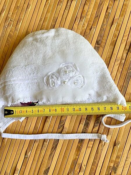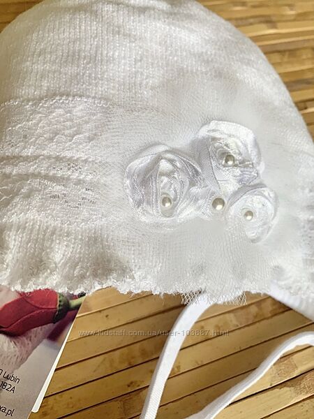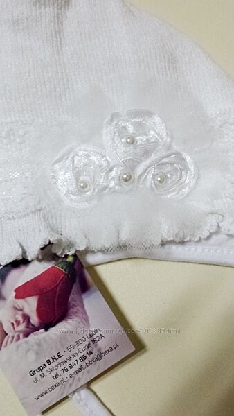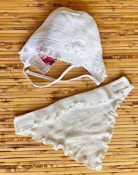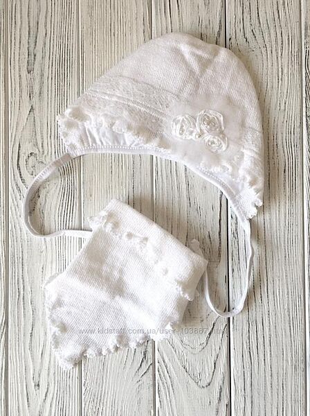 Нежный белоснежный красивый комплект - шапочка с манишкой из вязанного трикотажа на подкладке из 100% хлопка, с красивым декором, осенне-весенний сезон, для девочки.Хорошо растягивается, мягко облегает головку ребенка.