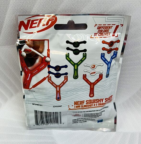 Nerf Squishy Shot Mini Slingshot and 2 Squishy BandsКожен пакет містить 1 міні-рогатку та 2 резинки для натягування.