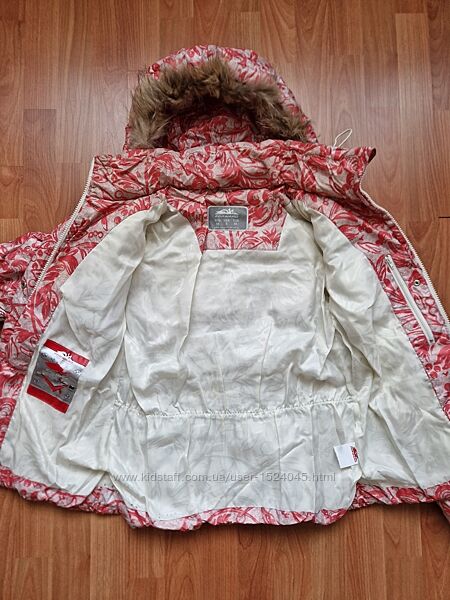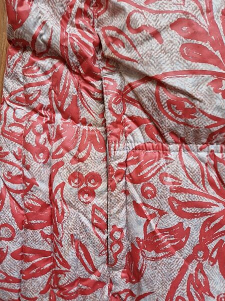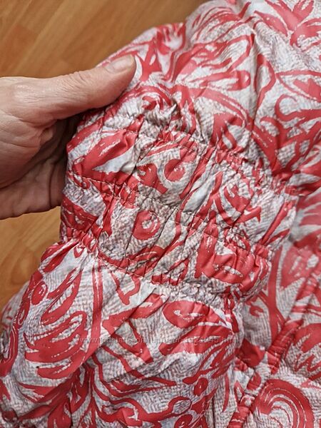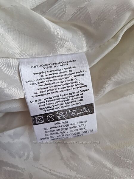 Состав: ткань верха - 100% полиэстер, подкладка -100% полиэстер, наполнитель - 85% гусиный пух, 15% перо.Длина 60,5 см, рукав 65 см., пог 48 см., по плечам 38 см.