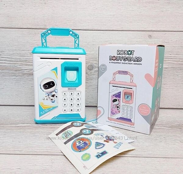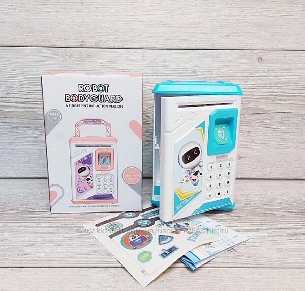 Сейф Робот копилка детская Robot Bodyguard с отпечатком пальца, музыкальная.Цвет Голубой и Розовый.