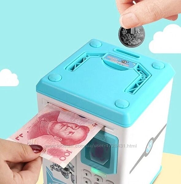 Эта копилка-сейф оснащена специальным механизмом, который срабатывает при поднесении купюры к купюрам приемника и затягивает ее внутрь, помещая в основное отделение копилки. В верхней части есть прорезь для монет, которые собираются в специальный лоток и не смешиваются с купюрами.