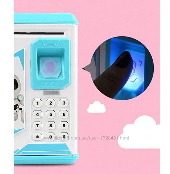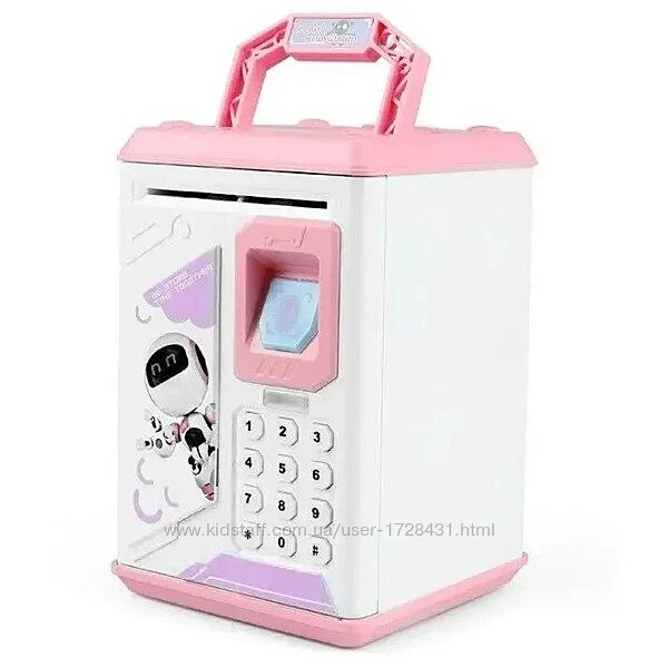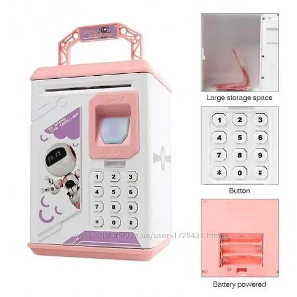 оригинальный дизайн в форме реального сейфа; надежная защита ваших сбережений, благодаря паролю, который легко меняется при необходимости; имитатор кнопки сканера отпечатков пальцев; возможность вносить как и бумажные деньги, так и копейки; большая емкость; легкий вес и хорошая компактность;Характеристики: