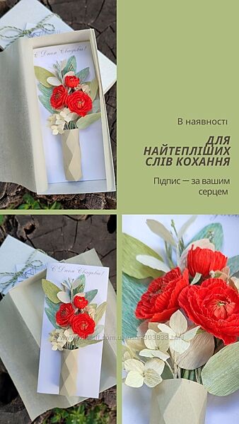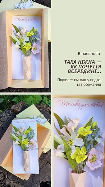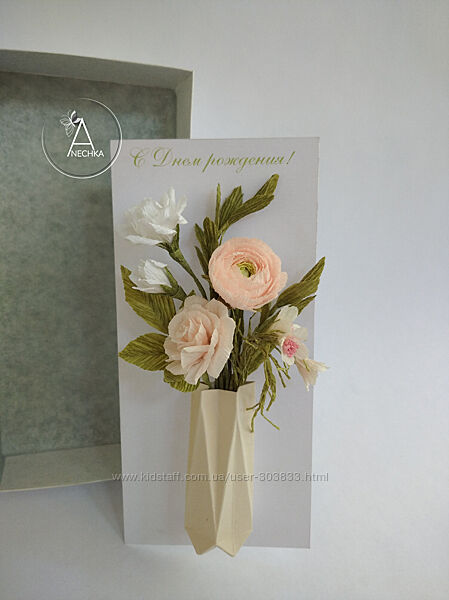 Зробить приємний подарунок, подаруйте своїй знайомій або близькій людині святкову об´ємну листівку ручної роботи з паперовими квітами.Індивідуальний підхід до створення кожної листівки.