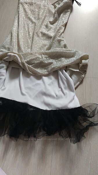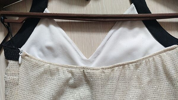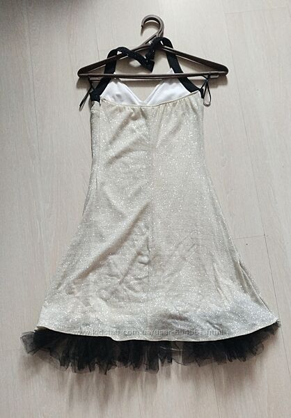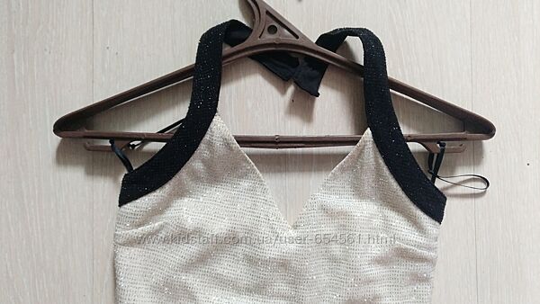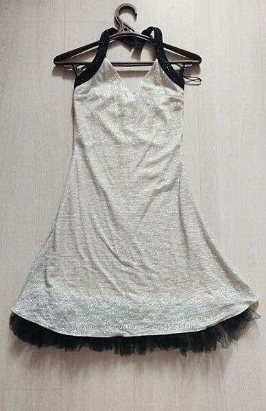 Легкое летнее нарядное вечернее платье для коктейльных мероприятий в классическом стиле, фирма Ses Exclusive. Светло-молочного цвета с черным. Натуральный трикотаж, декорированный блестящей нитью. Подклад платья по всей длине также трикотажный хлопковый, приятный к телу - можно с комфортом долго в нем находится. Внизу лаконичный фатин хорошего качества. Открытая спина по лопатки.Размер указан 38 (S/M), но я его одевала и на XS (если рост выше 160 и грудь 1-2 размера хотя бы - садится хорошо, просто надо будет пуговку вверху за шеей перешить чуть далее). Ткань тянется в ширину, поэтому сядет как надо на большинство комплекций указанного размерного диапазона.