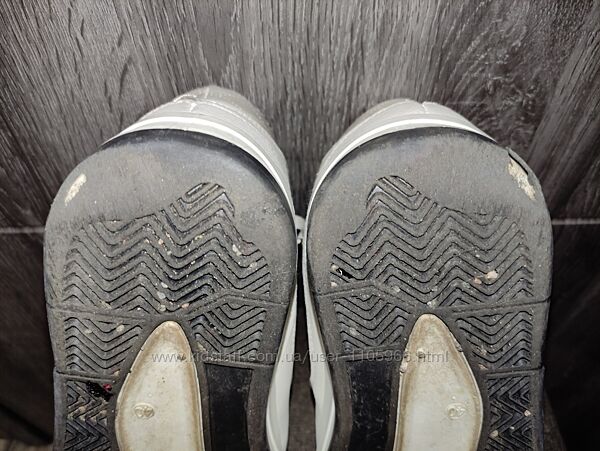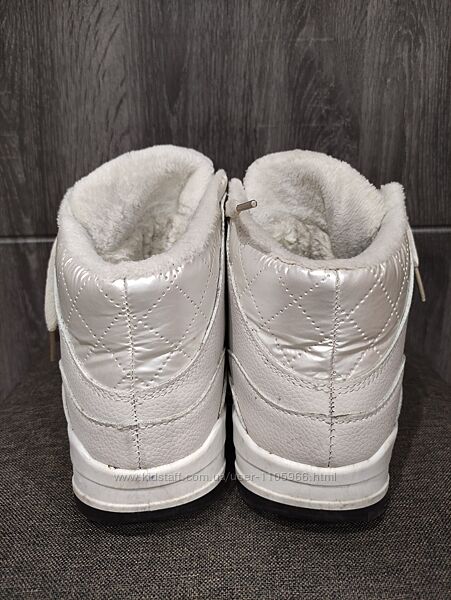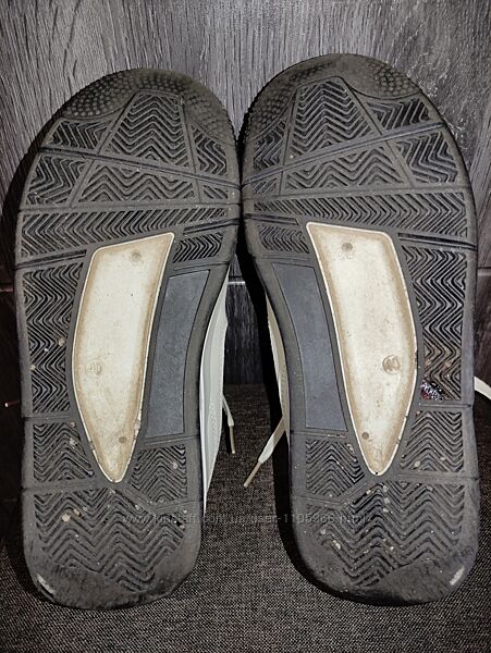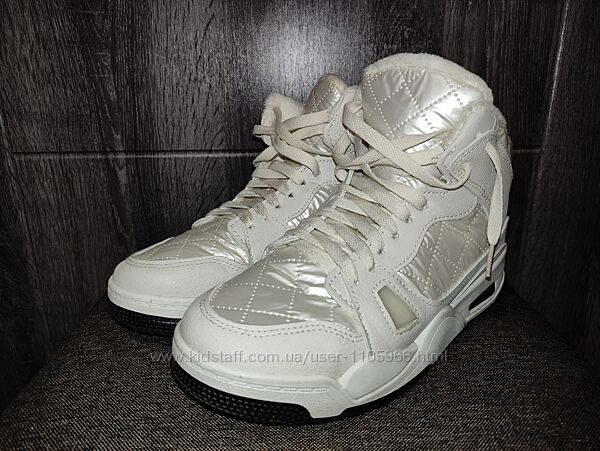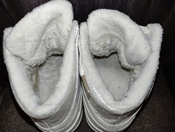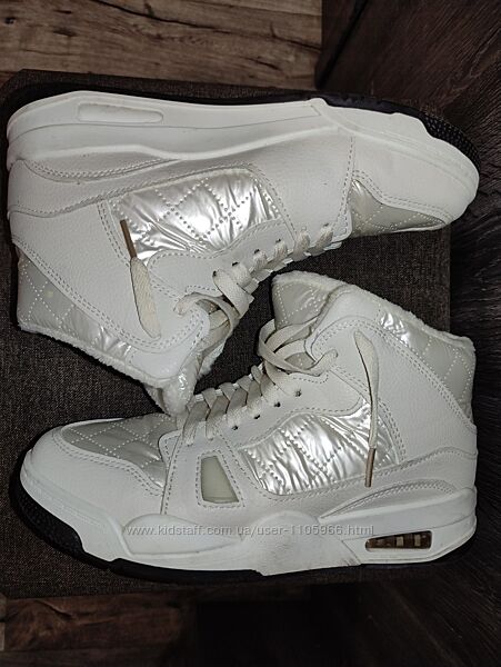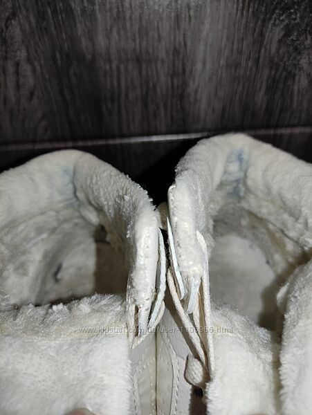 Отличные кроссовки-хайтопы на искусственном меху. Качество отличное - легкие, удобные, теплые. По льду абсолютно не скользят. Из нюансов - слегка покрасился мех в области пяток от синих джинс, что никак не влияет на функциональность. Верх - качественная искусственная кожа, вставки из дутой плащевки. Цвет молочный.Состояние идеальное.