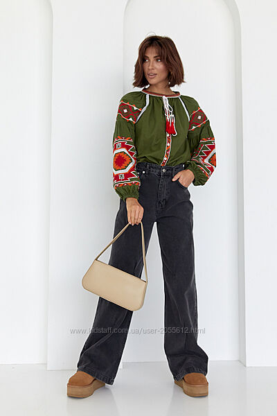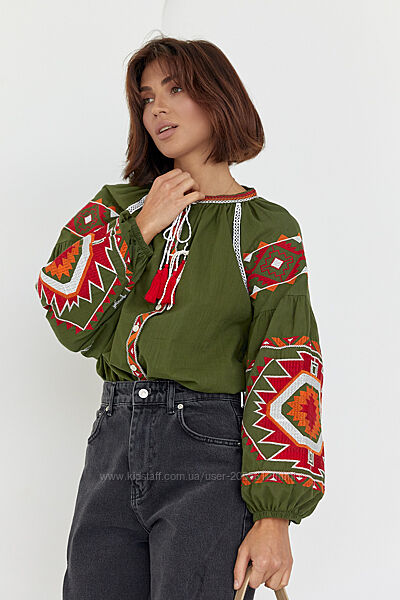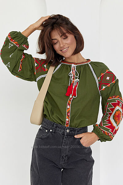 Подробное описание: Жіноча вишиванка на гудзиках з геометричною вишивкою гладдю