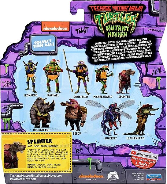 УПАКОВКА ФІЛЬМУ: Sensei Splinter постачається в блістерній упаковці з яскравими деталями, яка включає в себе фірмовий знак TMNT Mutant Mayhem.