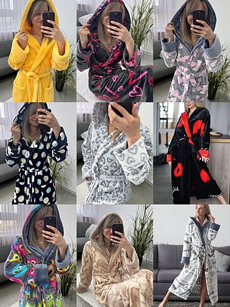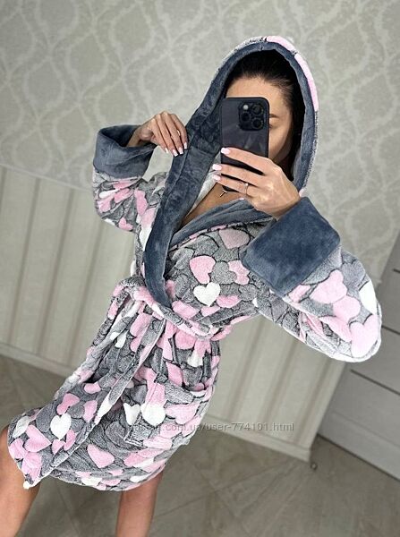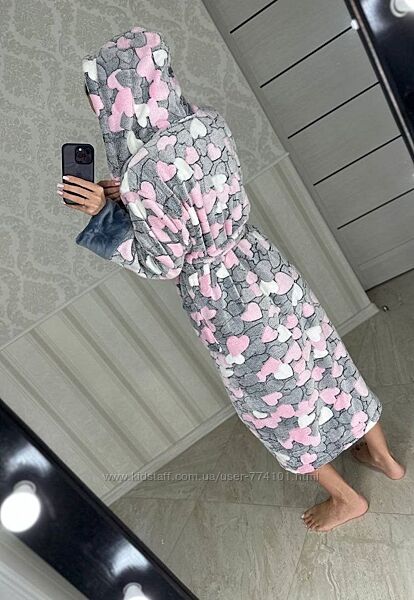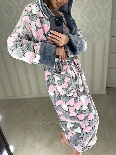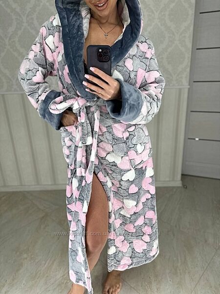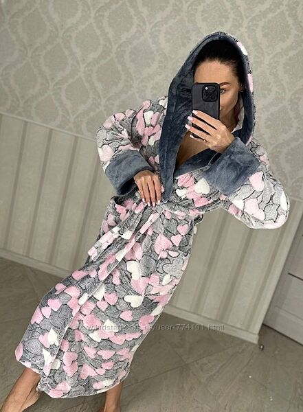 М´який, затишний та тепленький халатик з двостороннього велюр плюшу.З капюшоном , є кишені , пасок.