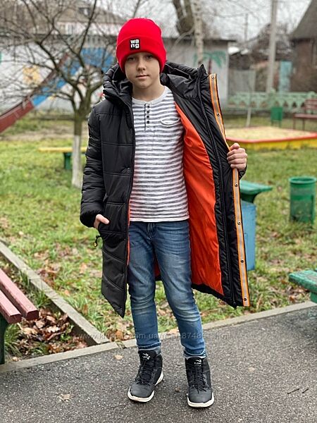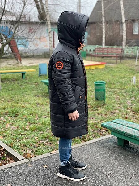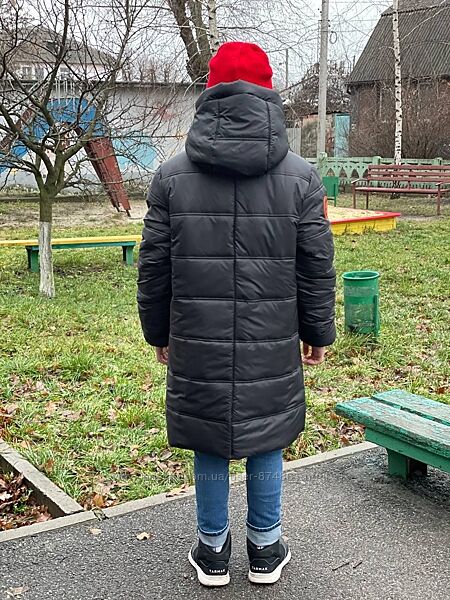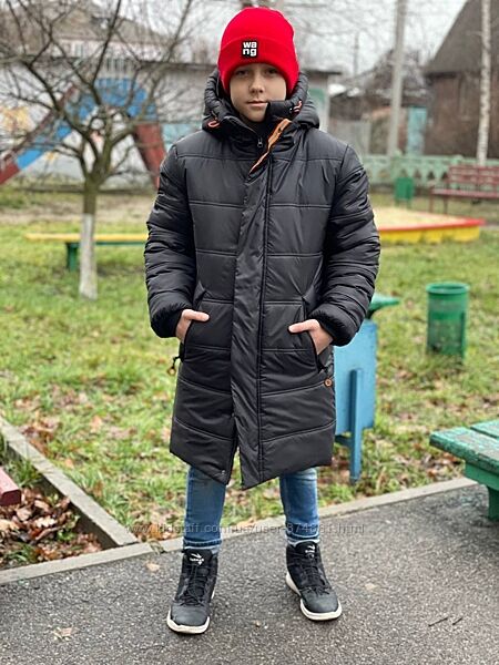 Підліткова зимова подовжена курточка на хлопчиків. Наповнювач синтепух легкий і гіпоалергенний, витримує холод до -25 °C. Силует прямий. М´які в´язані манжети по низу рукавів для комфорту і захисту від холоду. Капюшон регулюються кулісою. Дві кишені на блискавці. Застібка на блискавку з планкою на кнопках.