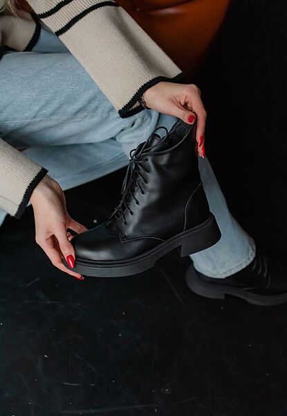 Подробное описание: Ботинки женские высокие демисезон кожаные шнурки и молния черные