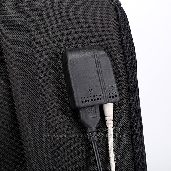 Рюкзак оснащен зовнішнім портом USB (USB-кабель і кабель для навушників — у комплекті) — просто вставте блок живлення (не входить до комплекту) у рюкзак і під´єднайте його до USB, і порт, розташований зовні рюкзака буде чудовим джерелом для заряджання телефона або інших подібних пристроїв.