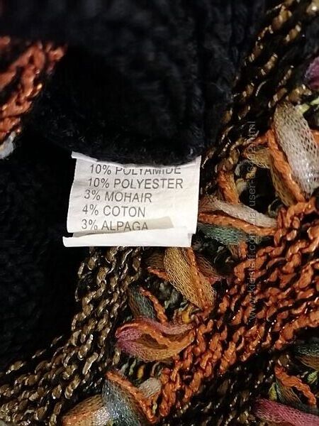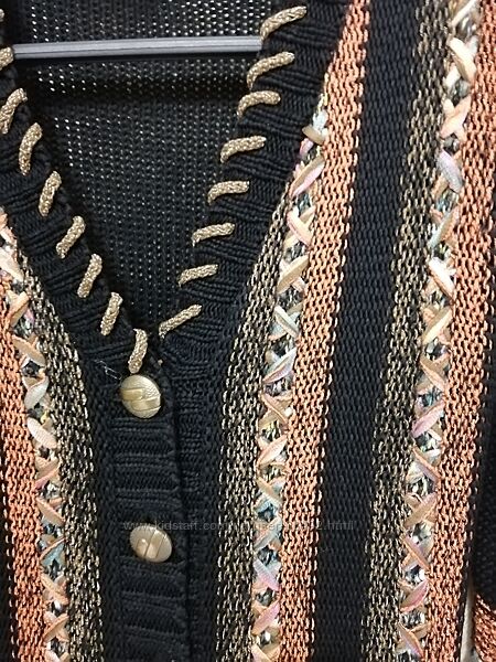 Трикотаж хусткової в´язки чорного кольору. Смужки яскравого рудо-теракотового (яскравіше, ніж на фото) з металізованою ниткою та смугами кавового з металізованою ниткою, а також тасьмою теракотового, хакі, золотистого, морської хвилі. На рукавах смуги пряжі букле різних кольорів. Металізовані нитки блищать тьмяно, не помітно. Ворот ефектно оздоблено кругову зв´язаною тьмяною золотисто-кавовою тасьмою.