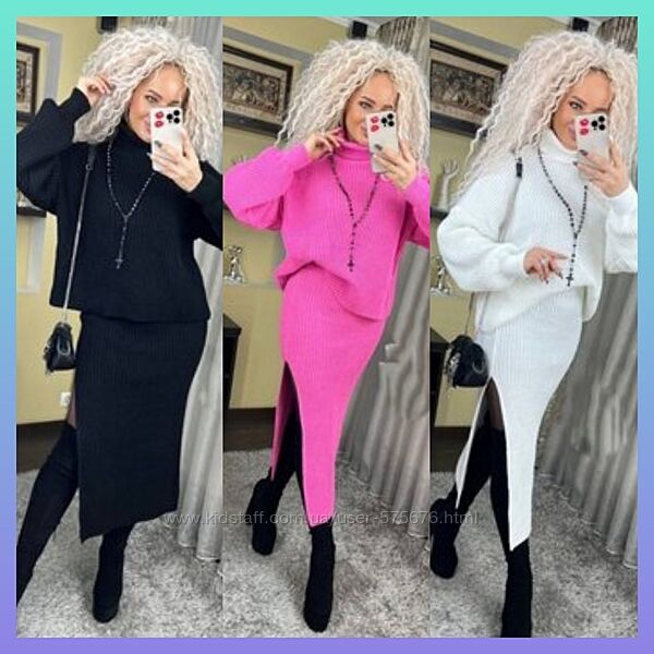Подробное описание: Р. 42-48 5 кольорів Модний вязаний костюм юбка довга з розрізом та светр