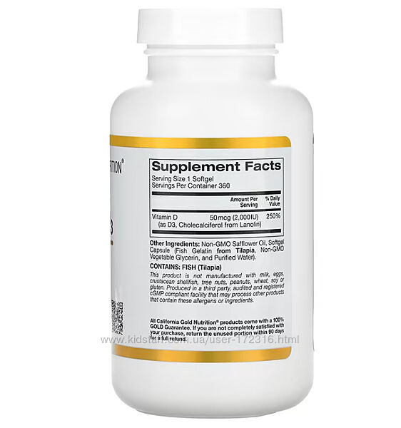 California Gold Nutrition, вітамін D3, 50 мкг (2000 МО), 360 капсул із риб’ячого желатину (CGN-01180)В наявності