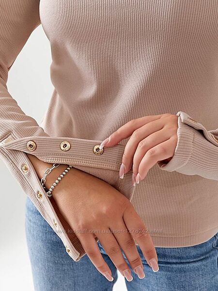 Ажурні декоровані кнопками рукава. Висока горловина, закрита планками, що приховують шви, гольф можна носити як під горло, так і як поло з відкритою горловиною.