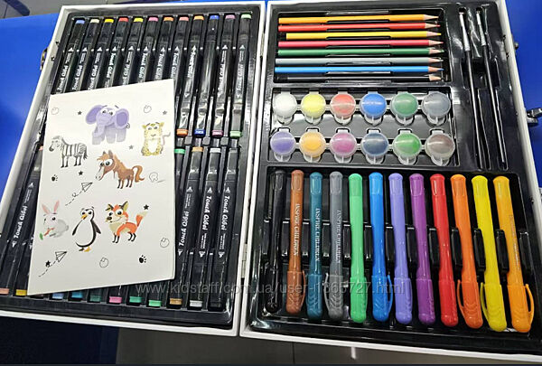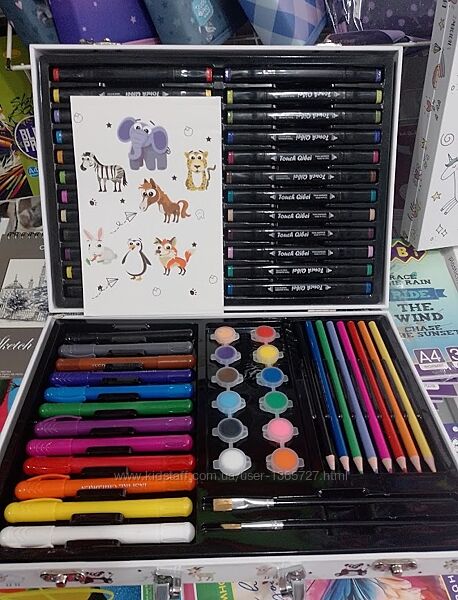 Включає всі необхідні інструменти для малювання — фарби, олівці, скетч-маркери, воскова крейда та інші аксесуари. Зручний та практичний кейс : Легко відкривається та складається, має ручку для зручності транспортування. Розвиває організованість та дисципліну : Кожен предмет має своє місце, що допомагає дитині підтримувати порядок під час творчості. Компактний та мобільний : Відмінно підходить для малювання вдома або у поїздках. Після гри кейс легко складається та застібається. Розвиток дрібної моторики та уважності : Набір допомагає розвивати координацію рук, увагу до деталей та акуратності. Відмінний подарунок : Ідеально підходить для дітей, які люблять малювати, та стане чудовим сюрпризом для будь-якого свята. Ергономічні відділення : Всі предмети зібрані у зручні відсіки, що допомагає дитині швидко знаходити потрібне. Характеристики набору для творчості: