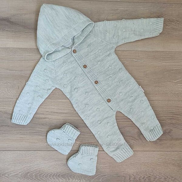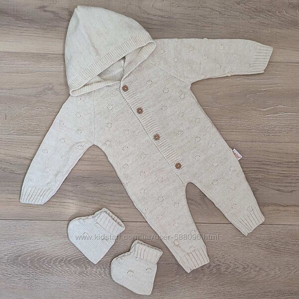 Комбінезон - м´який, зручний, необхідний в гардеробі немовлят. Комбінезон на гудзиках з капюшоном в комплекті з пінєтками. Незамінна річ для щоденних прогулянок.в одному розмірі 0-3 міс.