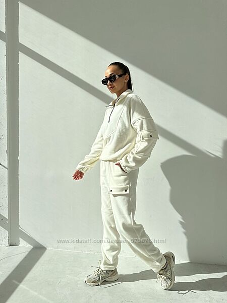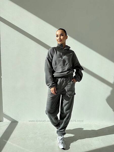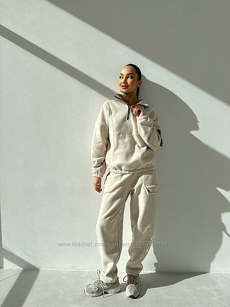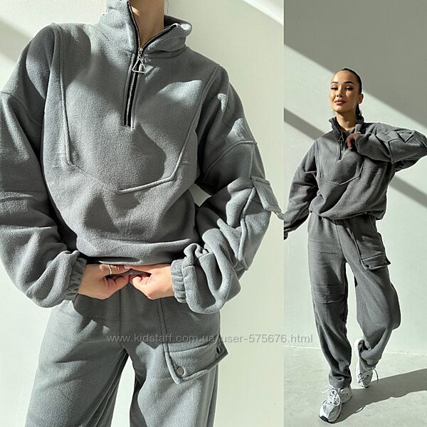 Дуже теплий та затишний костюм з двостороннього флісу. Толстовка з високим коміром на блискавці, низ на резинці. Штани прямого крою декоровані клапаном із заклепками.