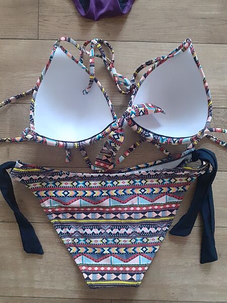 1. Фиолетовый Виктория Сикрет оригинал, размер М. Одет 2 раза. Замеры: плавки глубина посадки 22, ширина сзади до веревочек 35, спереди 25. Лиф: основание треугольника в растянутом виде 22, боковые стороны по 17. ----799грн.2. Цветной, фирму не помню, срезаны этикетки, но тоже покупала за границей, размер М. Одет 3 раза. Замеры: плавки глубина посадки 21,5, ширина сзади до веревочек 35, спереди 33. Лиф: основание треугольника в растянутом виде 16, боковые стороны по 17. ----399грн.