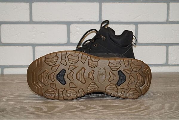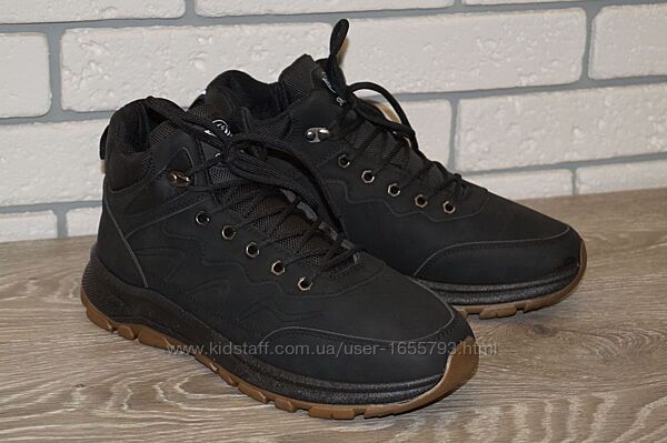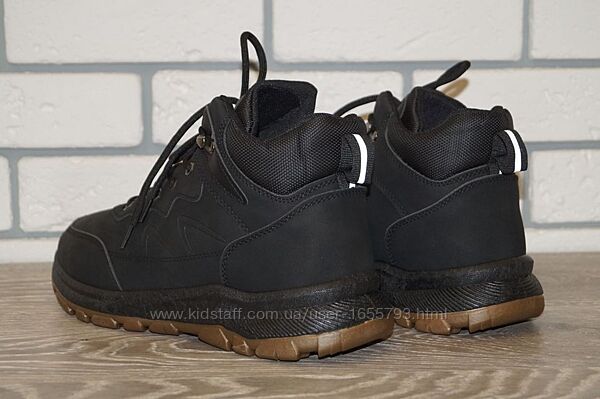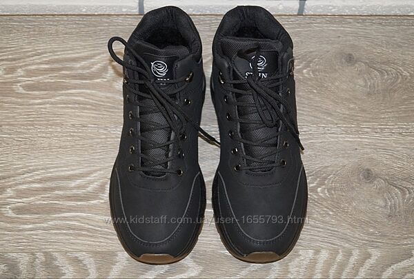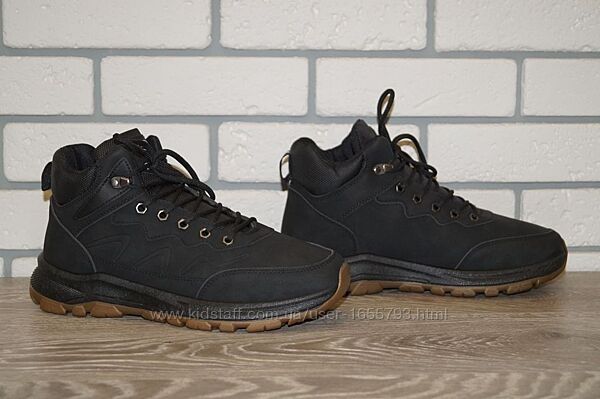 Чоловічі зимові черевики чорного кольору. Оригінальний дизайн черевиків дозволяє поєднувати їх як зі спортивними так і кежуал речами.Матеріал верху - штучний нубук