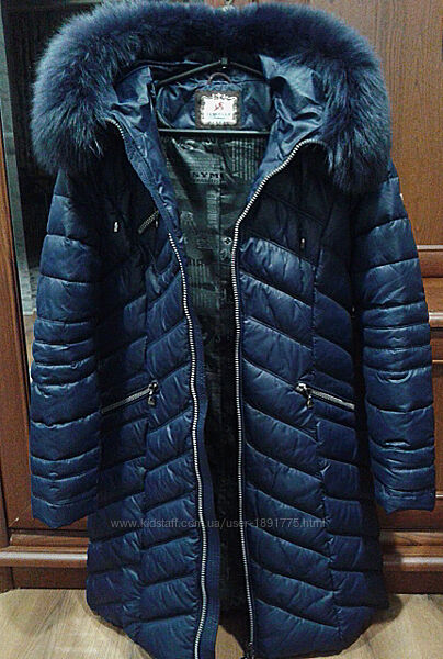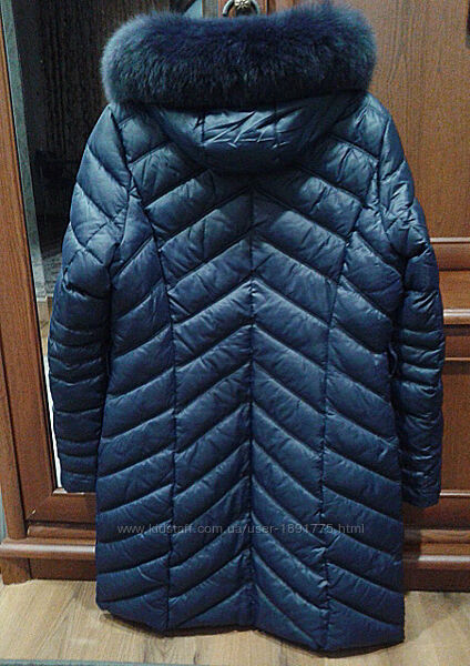 Женский зимний новый пуховик без бирки темно-синего цвета с натуральным мехом. Длина- 92 см по спинкеПОГ - 55 см