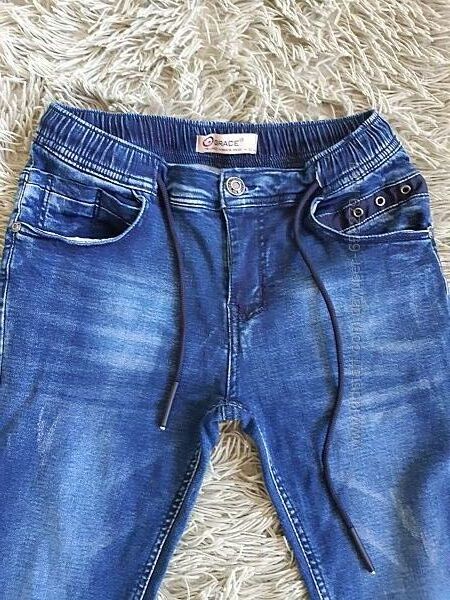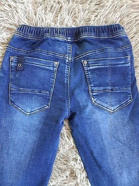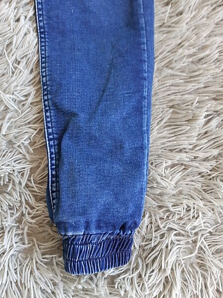 Джинсы джоггеры в идеальном состоянии. Покрой зауженый, ткань тянется. Резинка на кулиске для затягивания пояса.Длина по внешнему шву 92см