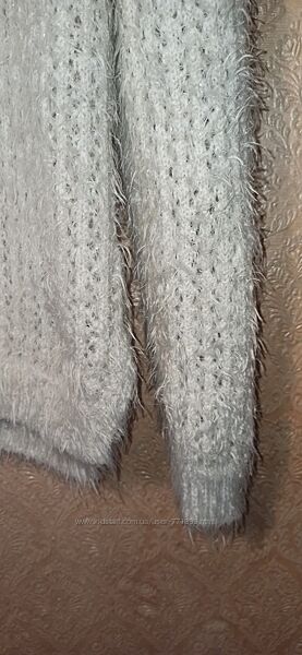 Цвет грязно белый с металлизированной нитью. Мягенький, приятный к телу. По бокам разрезы. Подойдёт на размер С/М . Длина 60 см Рукав 68 см Полуобхват груди 48 см. Тянется.