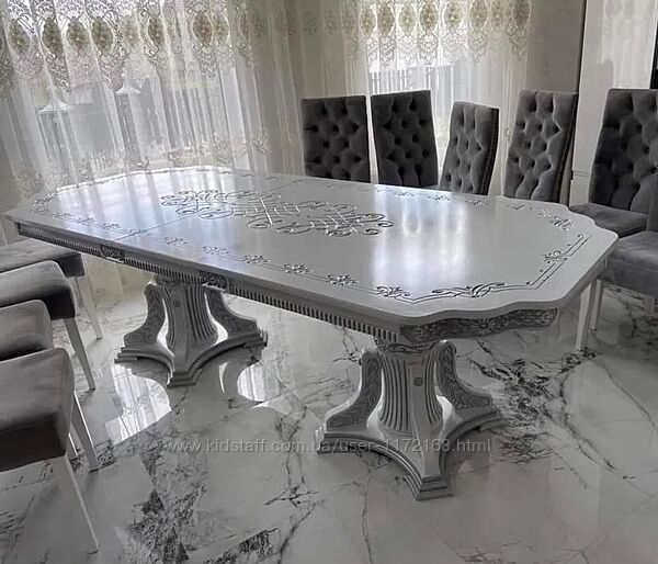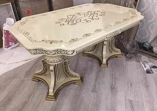 Ноги та каркас столу виготовлені з натурального бука, стільниця із шпонованого мдф, на стільниці, обкладці та ногах виконане декоративне різьблення.