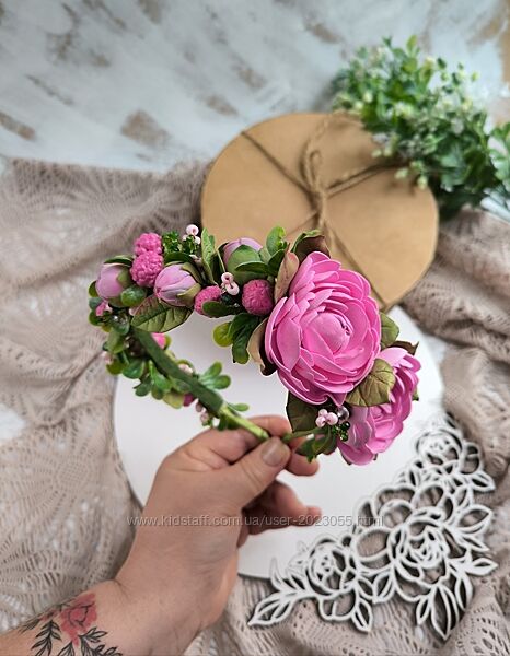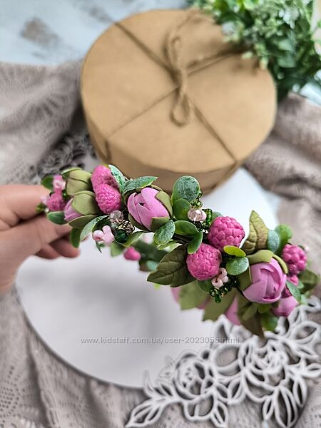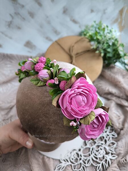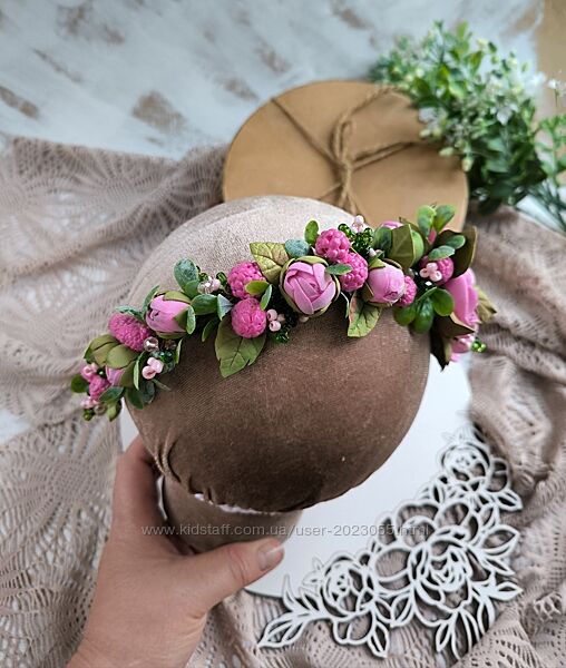 В наявності! Обруч з піонами, зеленню, ягідками та гілочками з бусинок.. Дуже красивий !Обруч легенький, квіточки 4 см та меньші, невеличкі!
