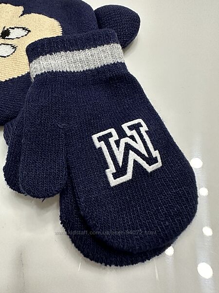 Комплект з шапочки та рукавичок. Мʼяка тонка вʼязка в два слої. Трохи еластичний трикотажний комплект. Двошарова дитяча шапочка з 3D-аплікаціями та підгорнутим подолом. Дитячі рукавиці прикрашені прогумованим принтом.