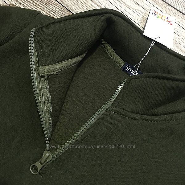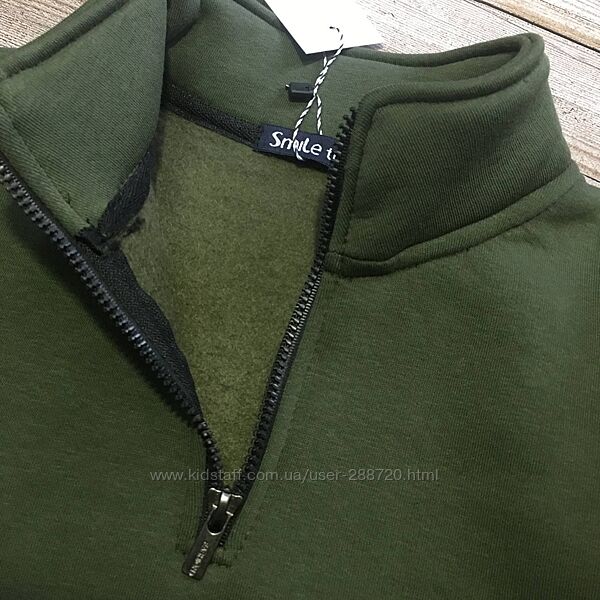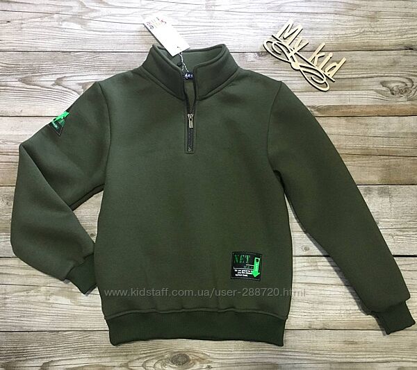 Тепла кофта дитяча, толстовка для хлопчика з тринитки із щільним начісом, 65% бавовни 35% поліестру. Толстовка для хлопчика з короткою блискавкою і високою горловиною - зігріє в холодну пору і замінить шарф. Низ та рукави кофти на манжеті, з боків у кофті кишені. Утеплена толстовка доповнена стильними нашивками.розміри 104.110.128