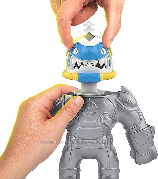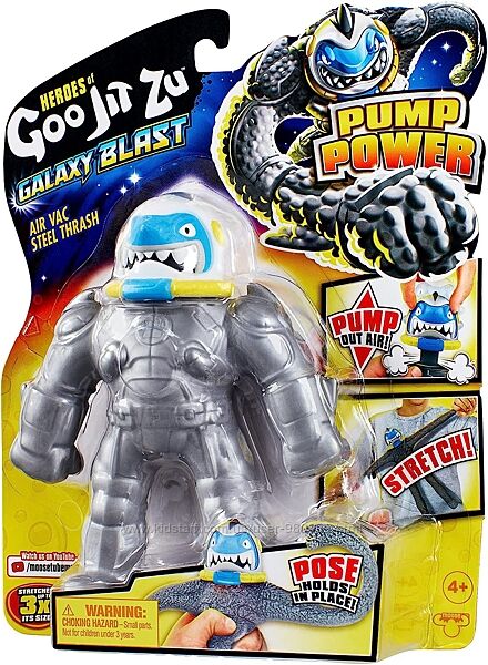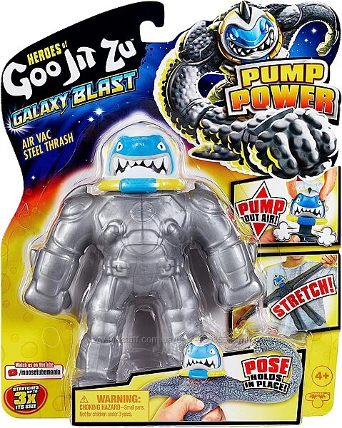 Фігурки Heroes of Goo it Zu Galaxy Attack Pump Power дають вам абсолютно новий спосіб гри з Goo Jit Zu! Накачайте голову, щоб висмоктати повітря для абсолютно нового досвіду розтягування, пози та утримання. Підготуйте Steel Thrash до атаки Vac. Покачайте його голову вгору та вниз, щоб видалити повітря з його тіла, щоб утворити вакуум у його Goo. Потім розтягніть його кінцівки і зігніть руки і ноги. Ого! Він може тримати свою розтягнуту позу!