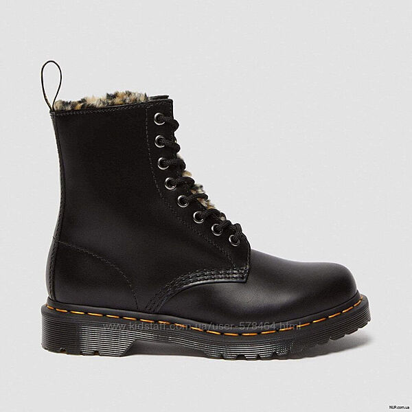 Зимові чорного кольору жіночі черевики на хутрі 1460 Serena з 8 люверсами, з леопардовим принтом на внутрішній стороні та язичці, виготовлені з гладкої атласної шкіри. Теплі, зносостійкі та стійкі до зими: WarmWair — мяка підкладка, що утеплює, виготовлена з ретельно відібраних матеріалів.
