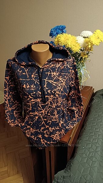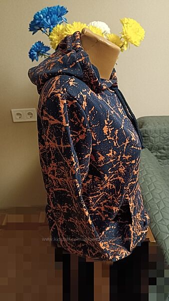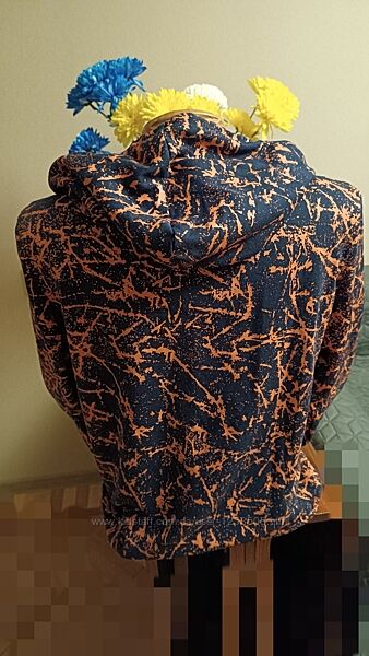 Качественный трикотаж трехнитка, петля - мягкая, довольно практичная, приятная ткань 100% хлопок.Очень оригиналньный принт - абстракция, красивый цвет- комбинация черного и кораллового.Раз.46. Замеры: плечи 43см., п/о.груди 54 см., дл. рукава от плеча 62 см., дл. по спинке 63 см.