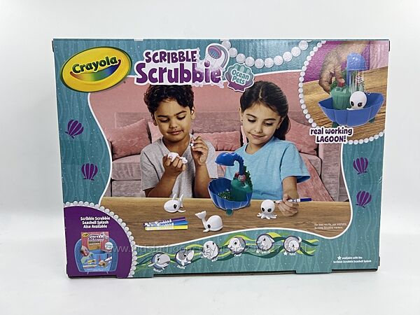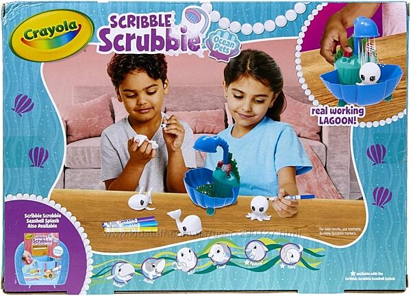 SCRIBBLE SCRUBBIE PETS: містить 1 блакитну лагуну, 4 морськх улюбленця , 6 змиваючих маркерів Scribble Scrubbie та 1 щітку для чищення. НАБІР МОРСЬКИХ УЛЮБЛЕНЦІВ: вирушайте в дику пригоду з акулою, восьминогом, китом і рибою-клоуном! Їхнє біле пальто з флоку дозволяє легко прикрасити їх як завгодно.МАРКЕРИ, ЯКІ змиваються: маркери Crayola, що миються, змиваються зі шкіри та більшості одягу, який можна прати.