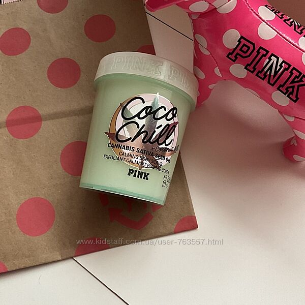 - Coco Chill з кристаликами сілі, заспокійливий, що надає сяйва шкірі скраб з кокосовою олією та екстрактом насіння конопель