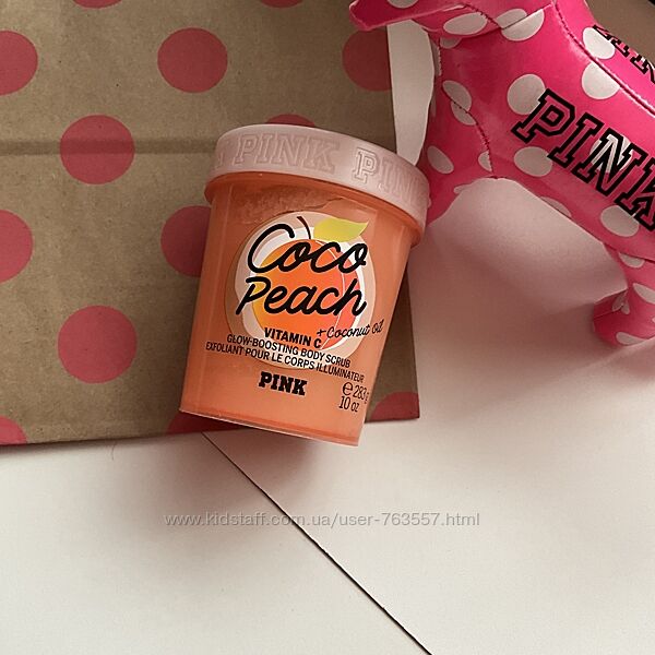 - Coco Peach відлущуючий скраб з вітаміном С та кокосовою олією для сяйва шкіри з ароматом персика.