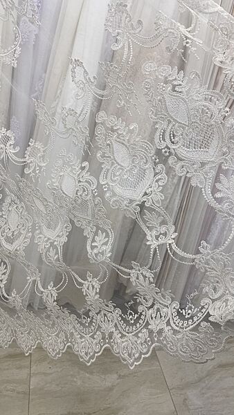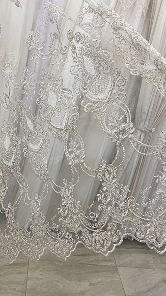 розпродаж залишків турецьких тюль .Основа фатін, є колір айворі і з золотим люрексом.