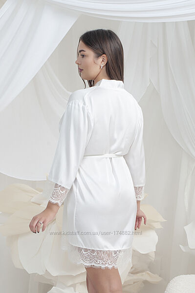 Жіночий халат з сатін-шовку у кольорі шампанського з мереживом виглядає дуже вишукано і елегантно. Сатін-шовк надає халату м´якого блиску і комфортного відчуття, що робить його ідеальним для домашнього відпочинку.Колір шампанського додає ноту романтики і розкоші, а деталі з мережива підкреслюють витонченість та жіночність моделі. Довжина трохи вище колін забезпечує зручність і практичність, а рукави 3/4 додають сучасності та елегантності образу.