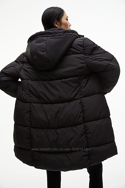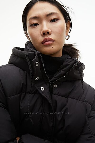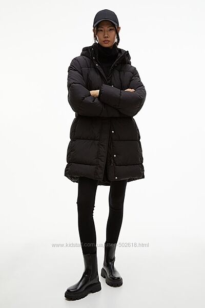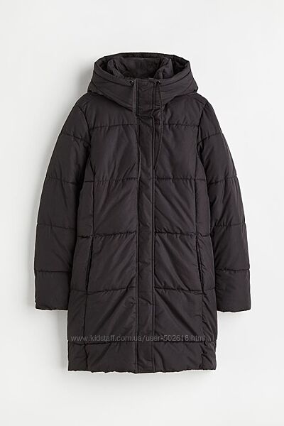 Утеплене пальто із тканини довжиною до коліна. Високий комір, капюшон на підкладці та кулісці. Двостороння блискавка, вітрозахисна планка та потайні кнопки спереду. Напівпотаємні кишені в бічних швах. Довгі рукави з прихованою внизу трикотажною манжетою в рубчик. На підкладці.Заповнення: 100% поліестер