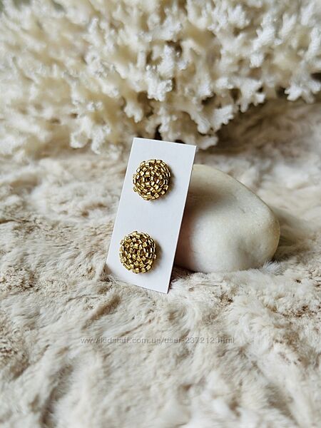 Подробное описание: Золотистые серьги гвоздики из бисера, круглые пуссеты
