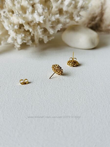 Золотистые серьги гвоздики из бисера, круглые пуссеты