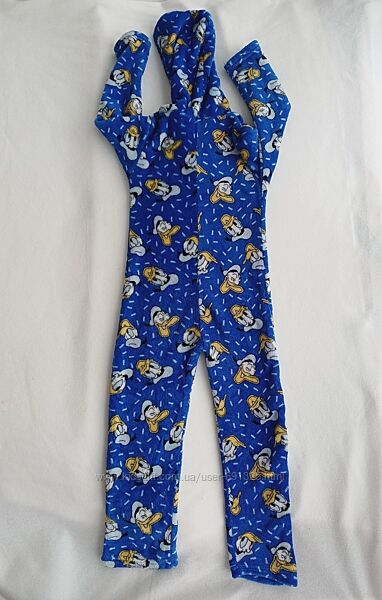 Пропоную теплу махрову піжаму-сліп з качкою Дональд Дак. Матеріал велсофт, двобічний, пухнастий і м´який, але тонкий. Вживана акуратно, стан дуже добрий, дефектів немає, дивіться фото.Розмір вказано на 7-8 років, довжина від плеча до промежини 55 см, до низу 104 см, ширина плечей 31 см, довжина рукава від плеча 41 см, ширина грудей під пахвами 32 см.