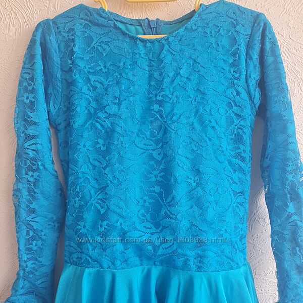 Плаття для танців для дівчинки. Колір насичено-бірюзовий. Зверху Тканина біфлекс., зверху прикрашена гіпюром. На рукавах резинки для пальців. Розміри: 38. На зріст 142 см)
