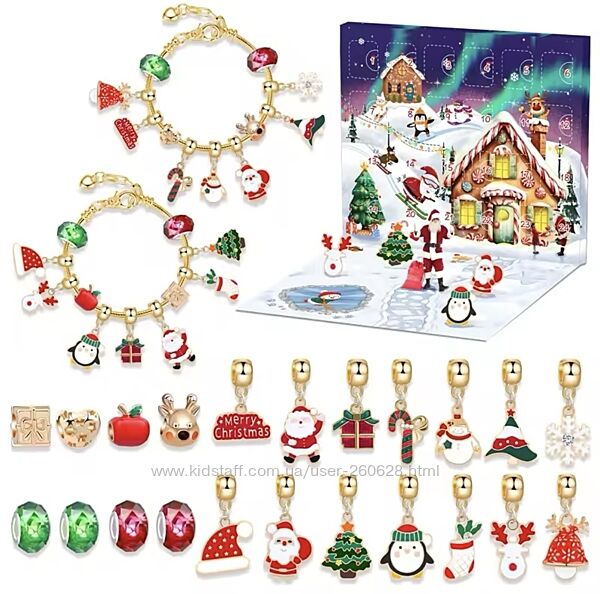 Адвент календар з прикрасами для дівчинкиНабір з 24 різдвяних прикрас - 2 браслети і 22 міні-перли, у тому числі ялинки, сніжинки, санта клауси і т.д.