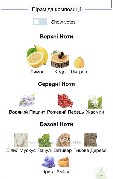 Кінцева нота: Амбра, Білий мускус, Ветівер, Пачулі, Тикове дерево