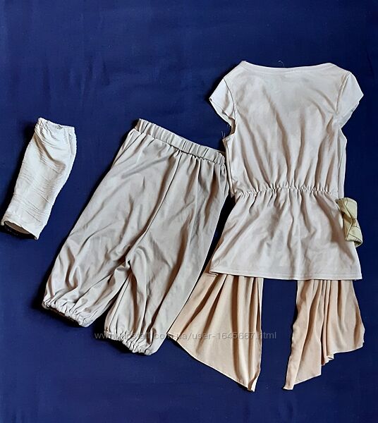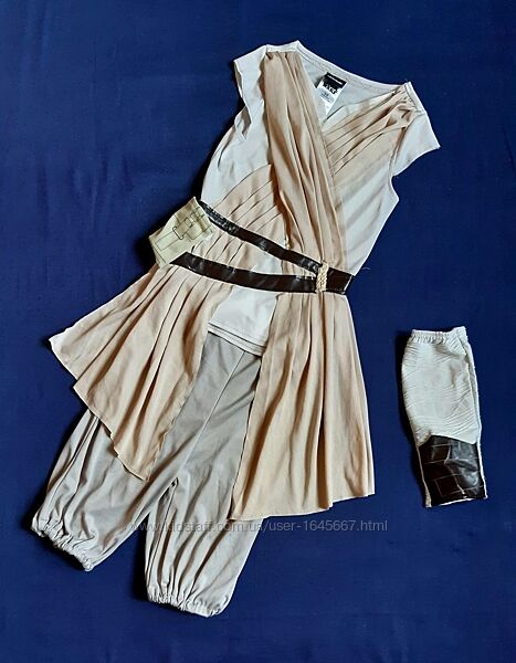 Рей Star Wars "Звездные войны" карнавальный костюм на 5-6 лет. Детский костюм Рей из фильма «Звездные войны: Пробуждение Силы». 7. Рей сражается вместе с Финном против империи и темной стороны силы. Костюм Рей Star Wars состоит из топа кремового цвета с рукавчиками, длинные, широкие пояса пришиты на плечи, которые Рей носит крестообразно спереди, как видно на фото. Ткань створок слегка структурирована. Обогреватель для руки сделаны из жатой ткани, только немного светлее. Штаны 3/4 светло-оливкового цвета с удобной резинкой на поясе.