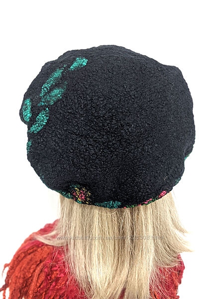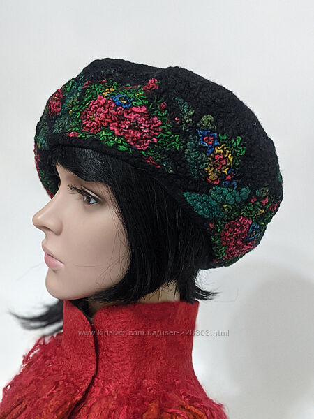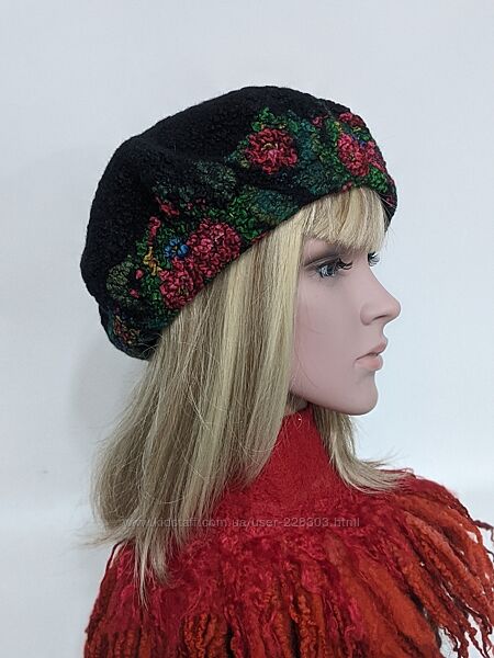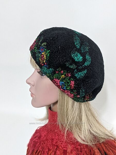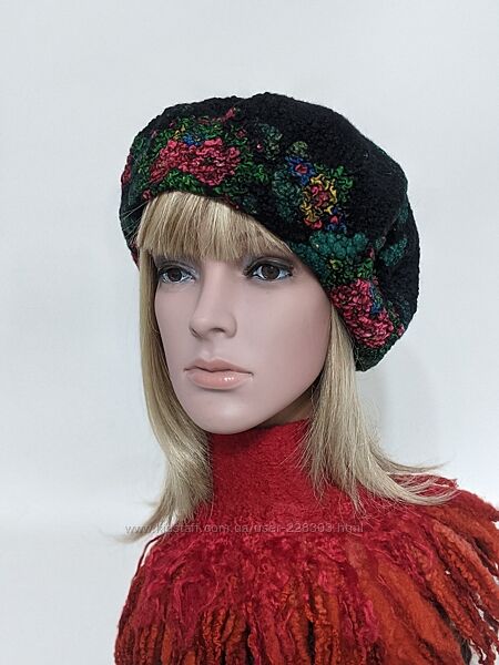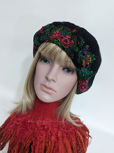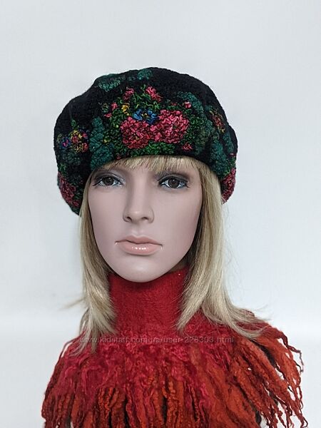 Берет ′Марічка′ зваляний вручну з овечої вовни 18 мкр (виробництво Італія), декорований шовковими і віскозними волокнами.