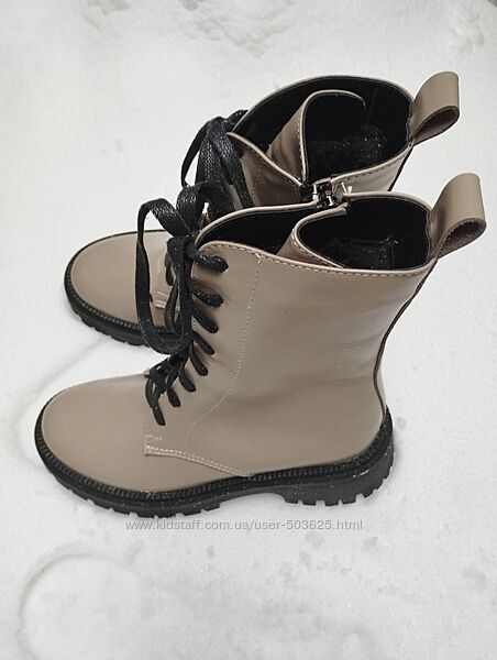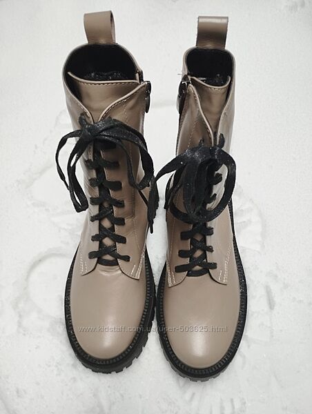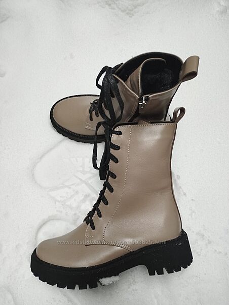 Зимові шкіряні черевики на шнурках, збоку є замок для зручності взуванняколір: бежевий, підошва чорна, виробник Україна