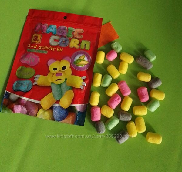Небольшие мини-наборы для творчества "Конструктор Веселая кукуруза".Детали этого необычного конструктора изготовлены из кукурузного крахмала и пищевых красителей, чтобы соединить детали между собой, нужно слегка смочить водой место соединения и прижать детали друг к другу. Совершенно безопасен для ребенка, поэтому его можно предлагать для игры даже малышам.